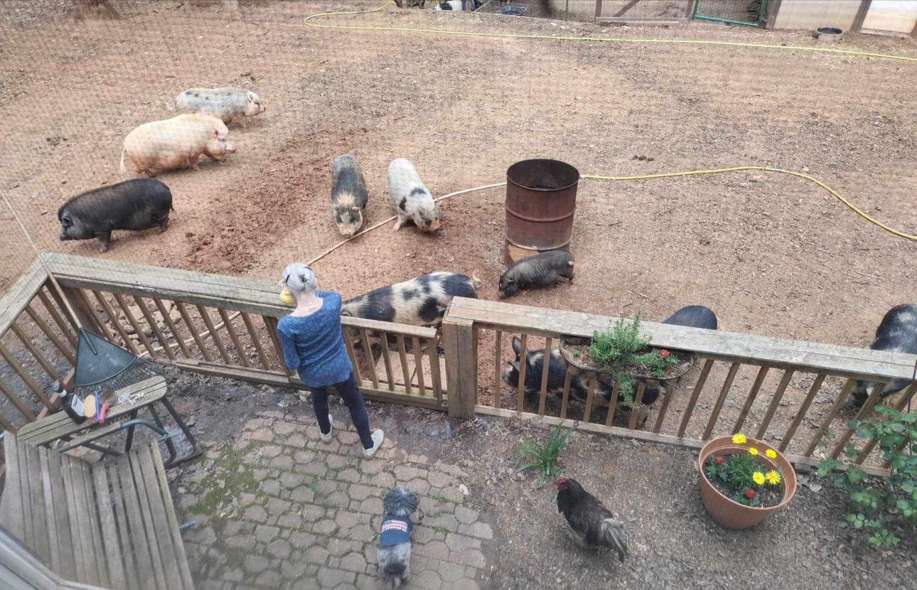 Fast forward to 4 years later and Amy and her boys are now taking care of 141 pigs! (it was 140, but literally the day before our interview, she was rescuing a new one). She’s also rescued a donkey and a horse, turkeys, rabbits, goats, the afore mentioned chickens and ducks, dogs and cats. This brings her total number of farm animals to 200.