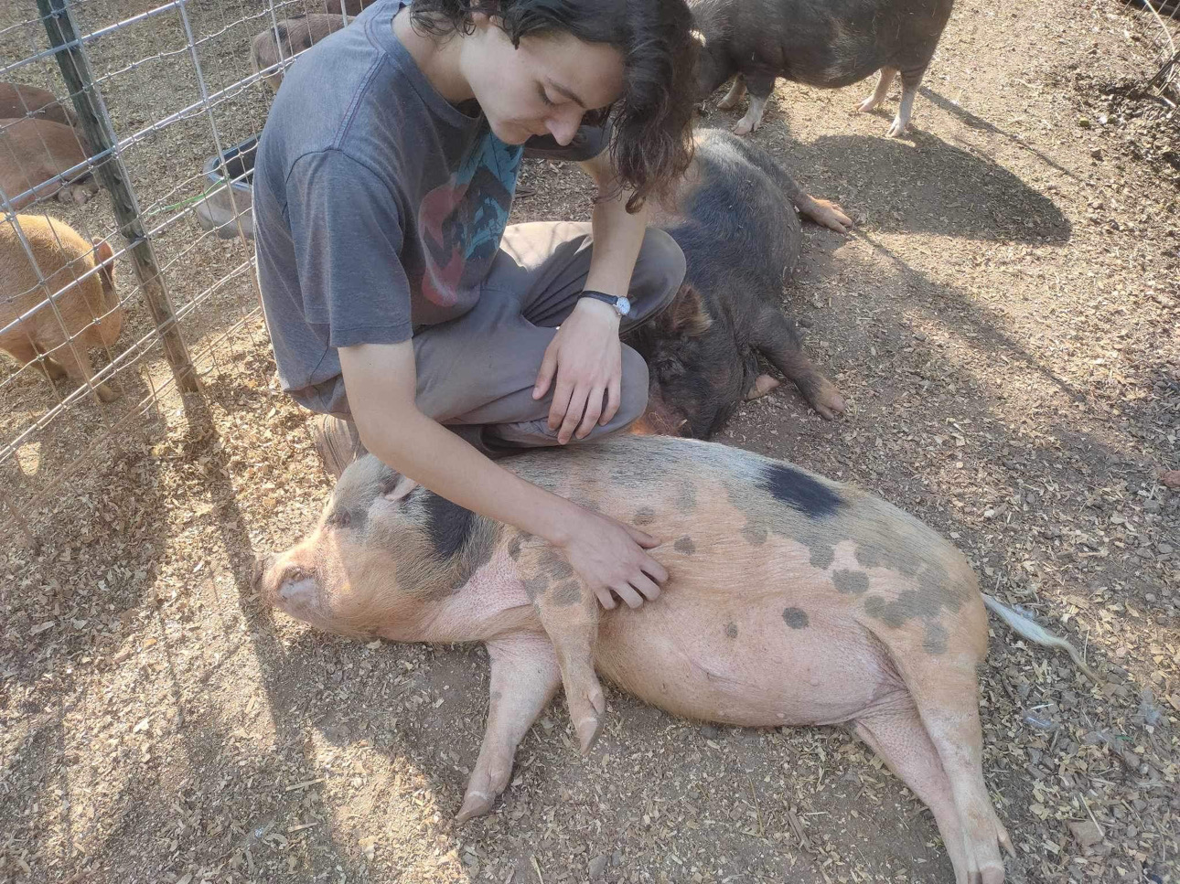 Gunner, Rockets older brother, has taken responsibility for several of the pigs himself. One of the oldest pigs on the farm, Jet who is 17 years old was struggling to keep weight on. Gunner took it upon himself to go out every day to take of Jet. He would even stand in the pouring rain to ensure his pig ate. Now, Jet has weight on him and is doing great!