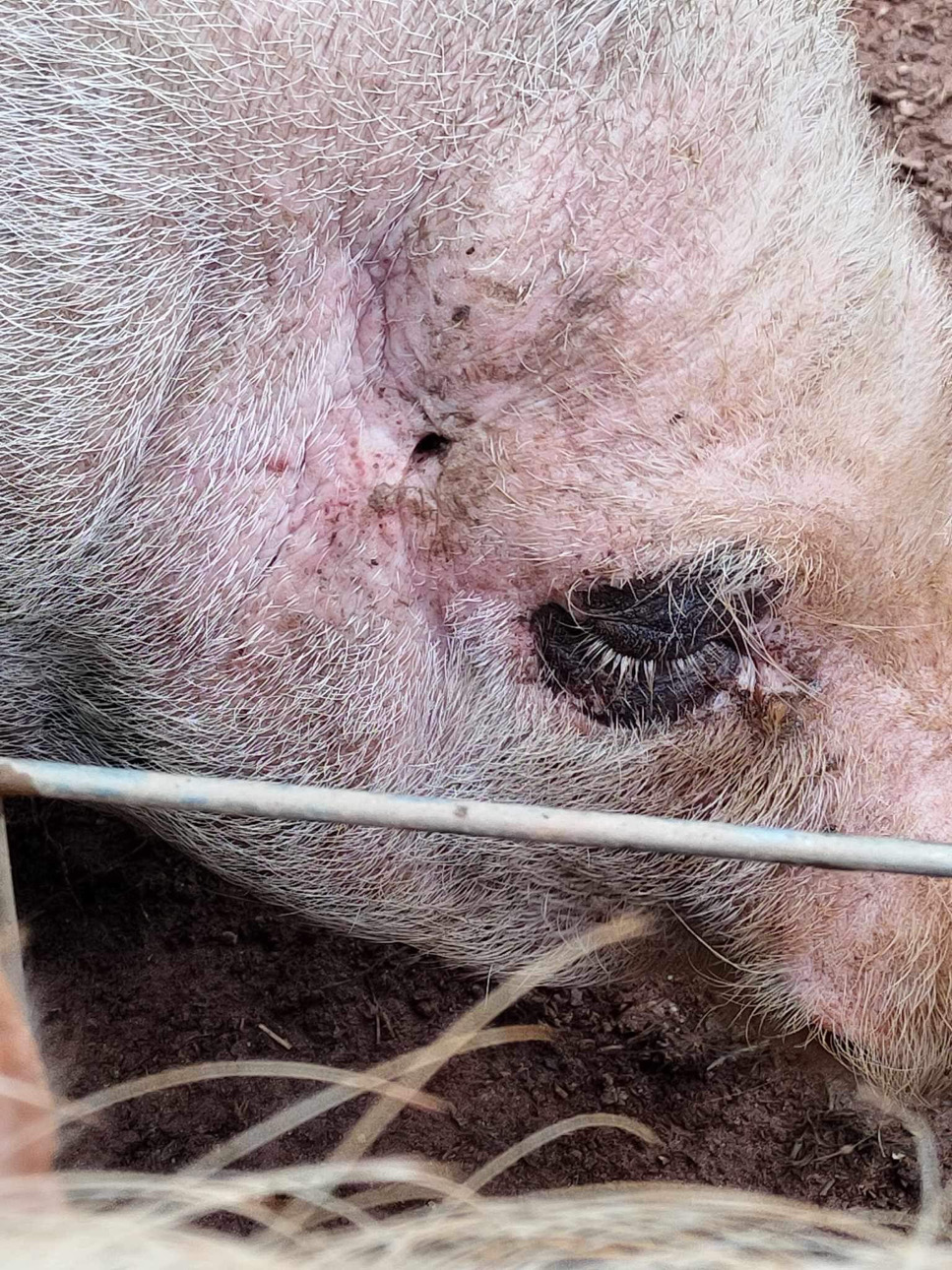 Rocket Cheddar, who was just Cheddar until Rocket adopted him and added his name, had been attacked severely by coyotes and had no ears left. When Cheddar first came to Harley-June, he interacted the most with Rocket, and they formed a bond. Since his ears are dismembered, he has 2 young female pen mates that act as his ears.
