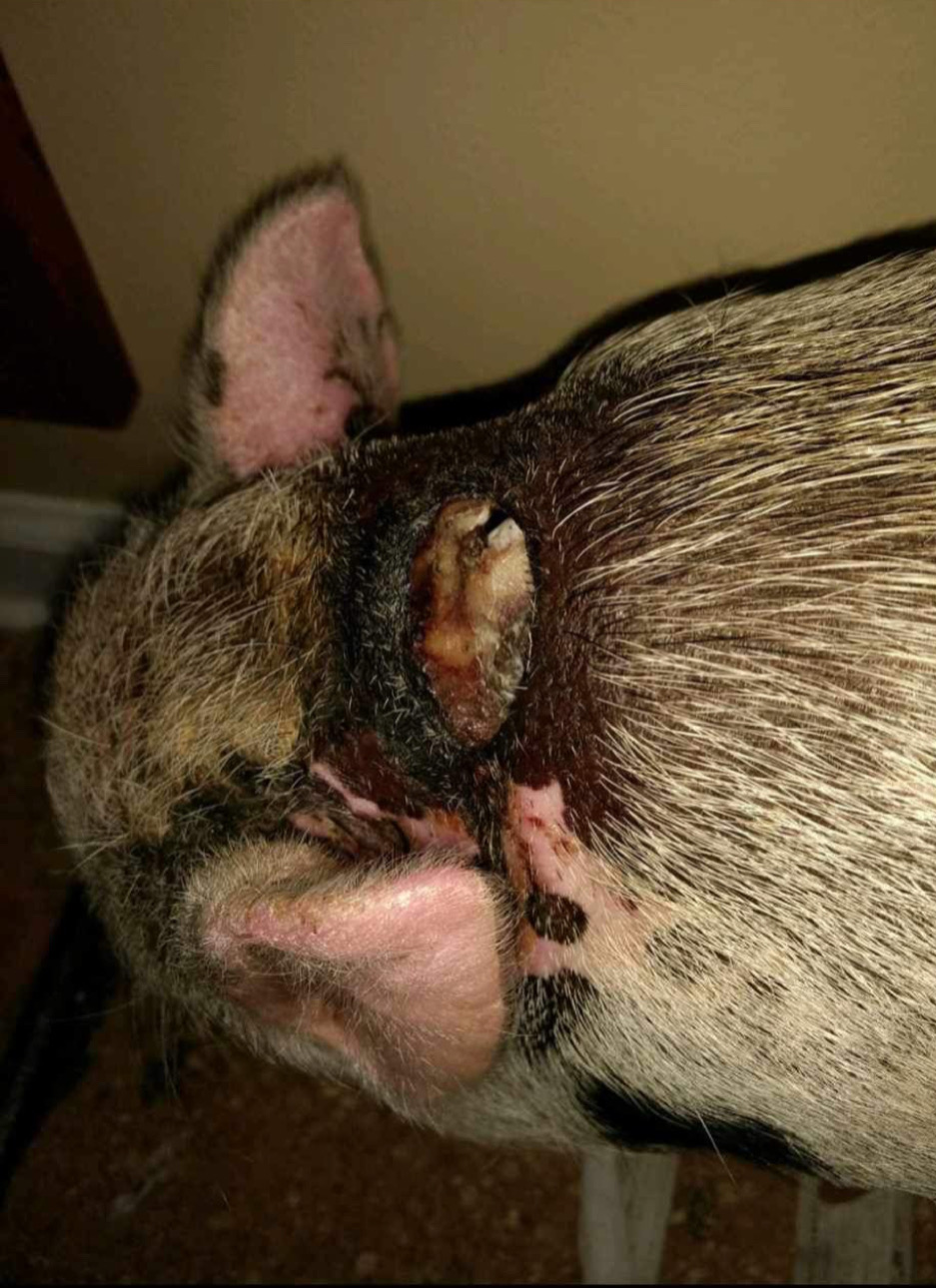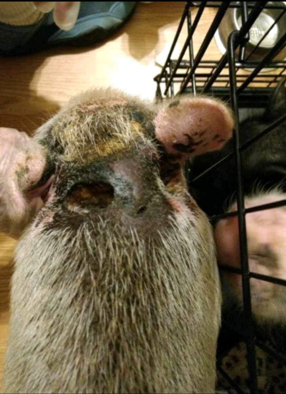 Then there’s Nala. This poor baby was also siezed from a meth house. When they found her, she had severe chemical burns all over her body and was addicted to meth. She was severely obese because her owner had been feeding her dog food. She was originally rescued and put through a detox program by a smaller rescuer near Amy in Hubert, NC, Piggies by the Sea. 2 months later, when she was fully detoxed and had lost enough weight, Amy and her family took Nala in and healed her skin and continued the proper pig diet she got put on. She has continued to loose the extra pounds and her hair is growing back!