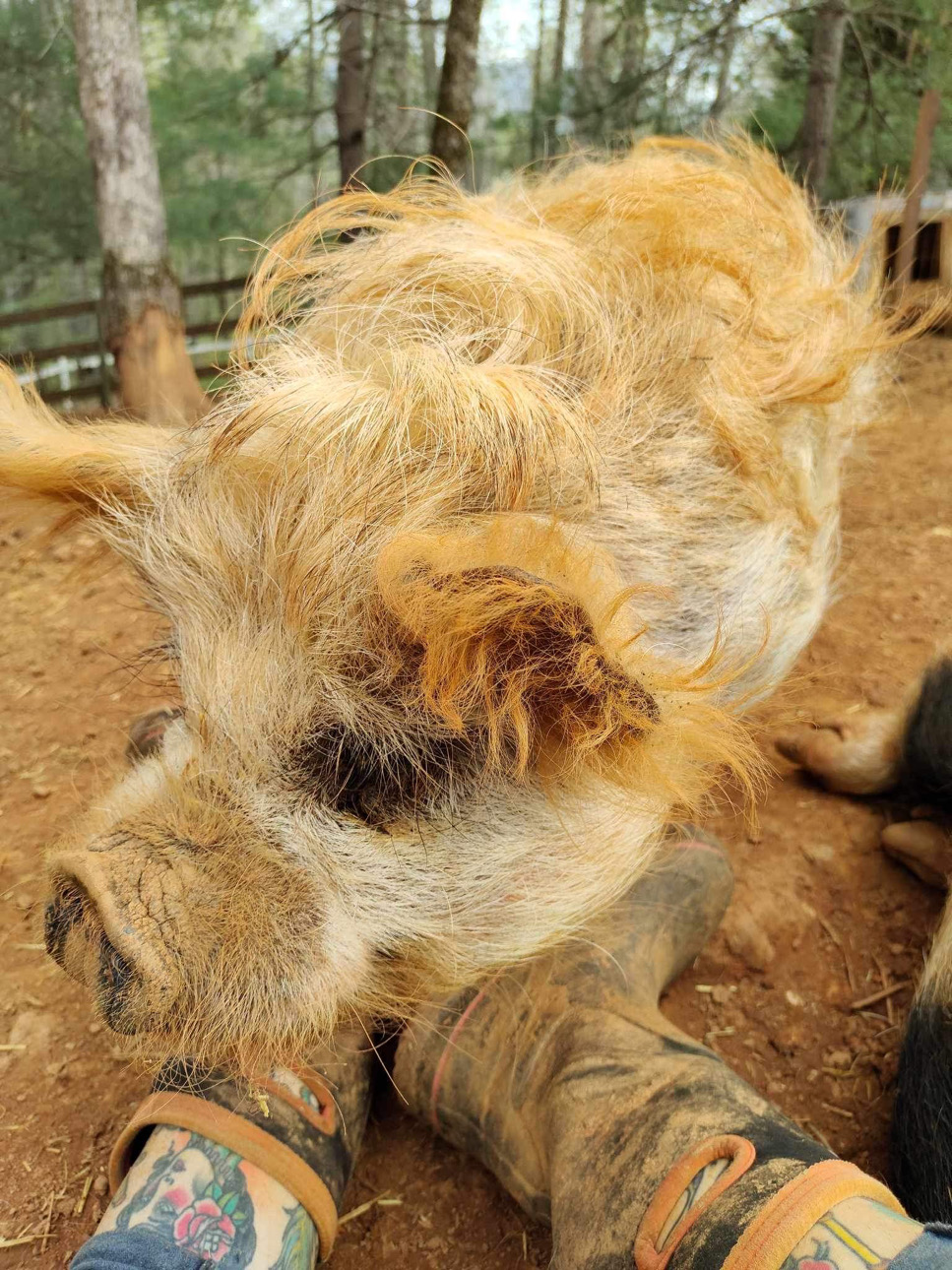 There was the time that she ran out with only one boot on and pajamas to chase off a bobcat going after her piglets and tearing her rotator cuff in the process. Or the time she chased off coyotes attacking two of her pigs (they survived with little damage). Oh, and there’s a friendly neighborhood bear that lives at the end of her street. During coyote season, the threat to her animals is even greater, so she will either sleep in the field in a tent to keep watch, or in the pen with the ones she feels need extra protection.