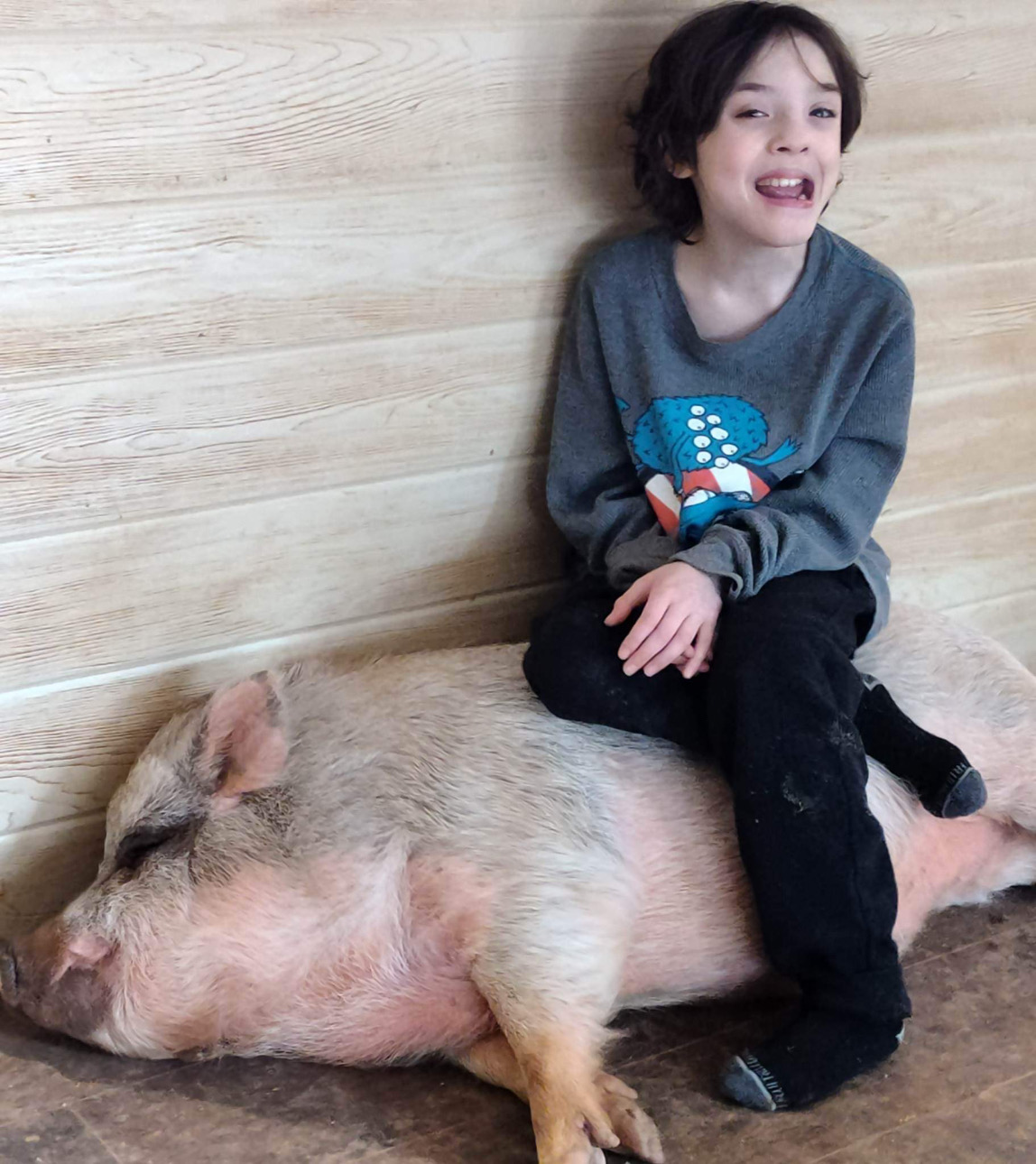 Rocket has a whole “good morning” and “good night” routine with the herd. He starts each day after snuggling in a pig pile, saying good morning to every animal by name and ends each day the same way, tucking them all in. The pigs let him sit on them and play veterinarian with them, allowing him to check their eyes and ears and give them pretend shots. It is the most pure and precious thing! This is what keeps Amy going. In rescue, it is a huge emotional strain. You see a lot of really horrible situations, and really horrible people in the process. But the way Rocket and Gunner love all the animals brings Amy a joy that is unmatched, and negates the horrible experiences.