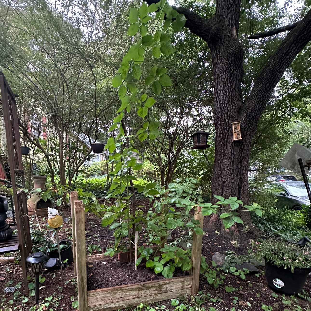 We disassembled what was left, flipped it upside down and put it around the Blackberries. Once it was put back together, we filled it halfway with soil and cut the plastic pot away from the plant. I then put an overripe banana all around the base of the canes and filled the rest with soil. You can’t really see the height of the plant in the picture below, but it is at least 6 feet tall!